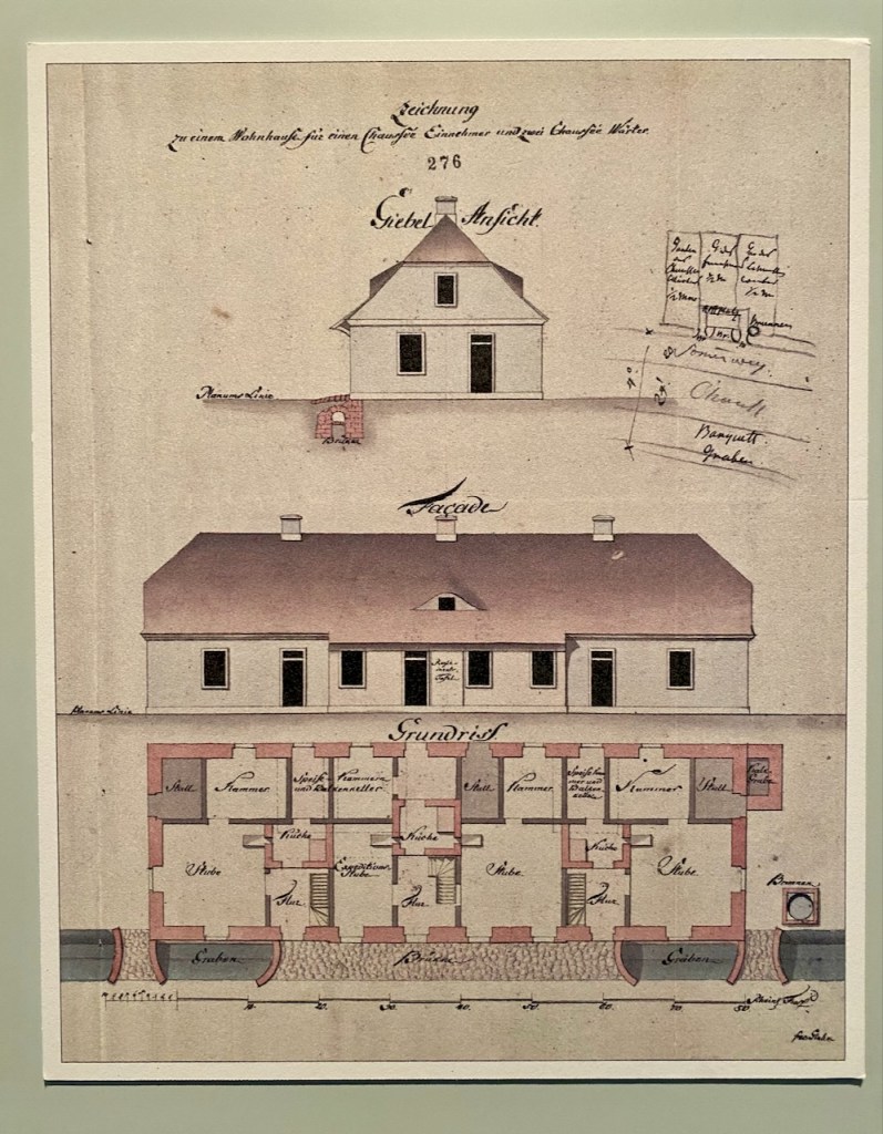 Das Thema Chausseen und ihre Entwicklung ist auf einen Bereich von 2×3 Meter begrenzt, dementsprechend war der Informationsgewinn geringer als erhofft. Im Eingangsbereich gab es noch ein Querschnitt durch einen Weg, wo die Schichten vom Bohlenweg bis zur Asphaltdecke schön nachvollziehbar waren.